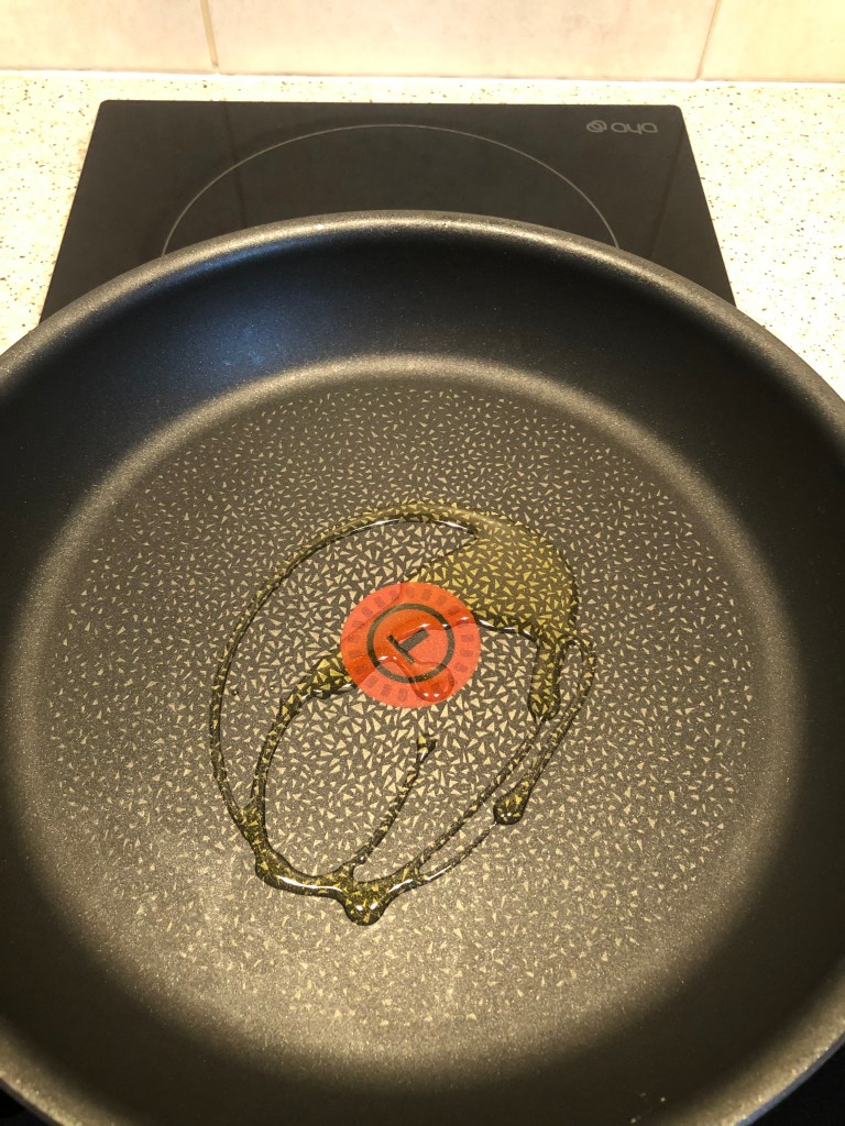 - Faire chauffer un filet d’huile d’olive dans une grande poêle