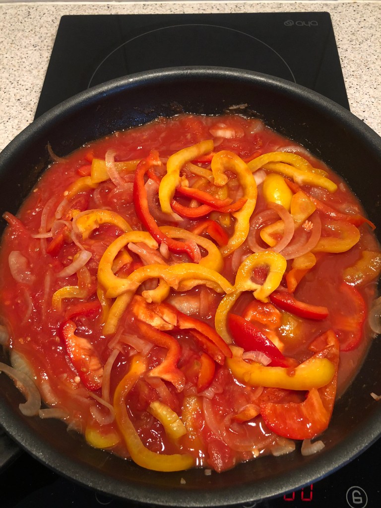 - Rajouter la pulpe et le coulis de tomate puis laisser mijoter jusqu’à réduction des poivrons (environ 30min à feu doux, ils doivent être fondants et non croquants)