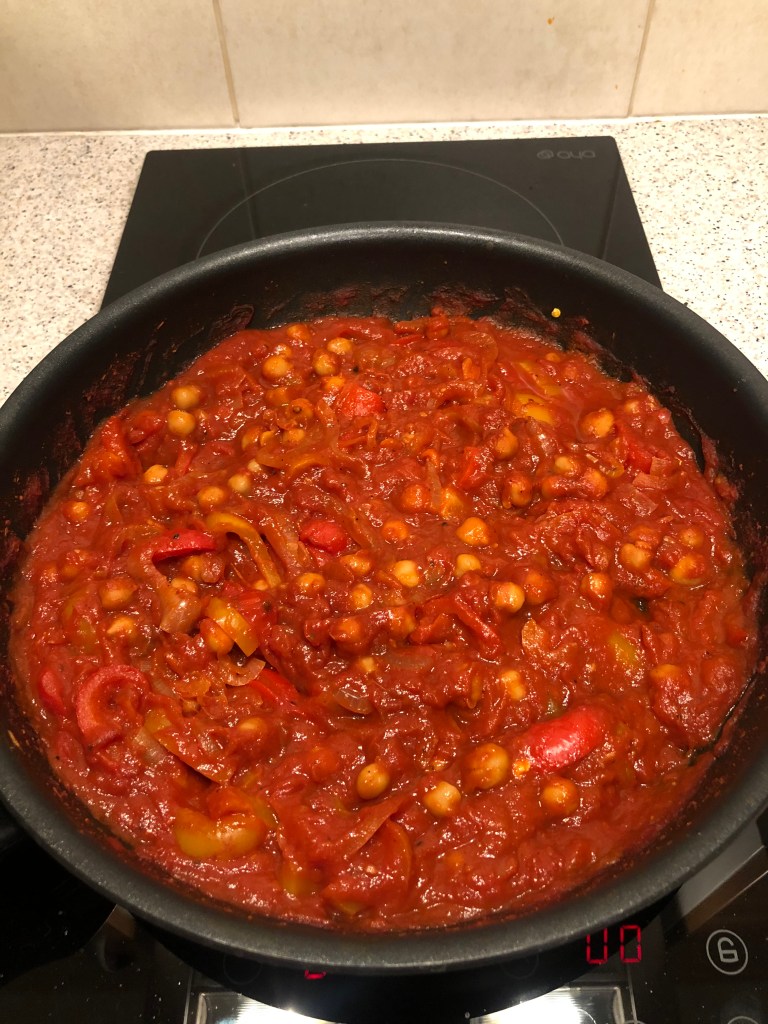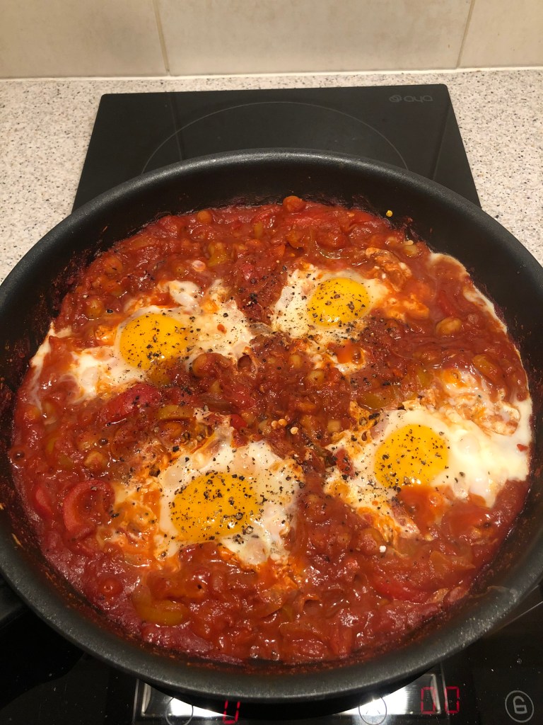 Ce plat coloré originaire d’Afrique du nord est revisitable à souhait selon ses envies et selon ce qu’on a sous la main… Très simple à préparer, il peut entièrement se réaliser avec uniquement des ingrédients de base que l’on devrait tous avoir dans sa cuisine ou son placard (des œufs,de la pulpe et du coulis de tomate, des oignons, des pois chiches) pour les jours où il n’y a pas de produit frais au frigo et qu’on veut tout de même manger correctement. Il s’accompagne avec des pâtes, du riz, du boulghour, du pain…(aliments qu’on à généralement toujours chez soi aussi). Aucune excuse pour mal manger ou sortir un plat industriel 😉