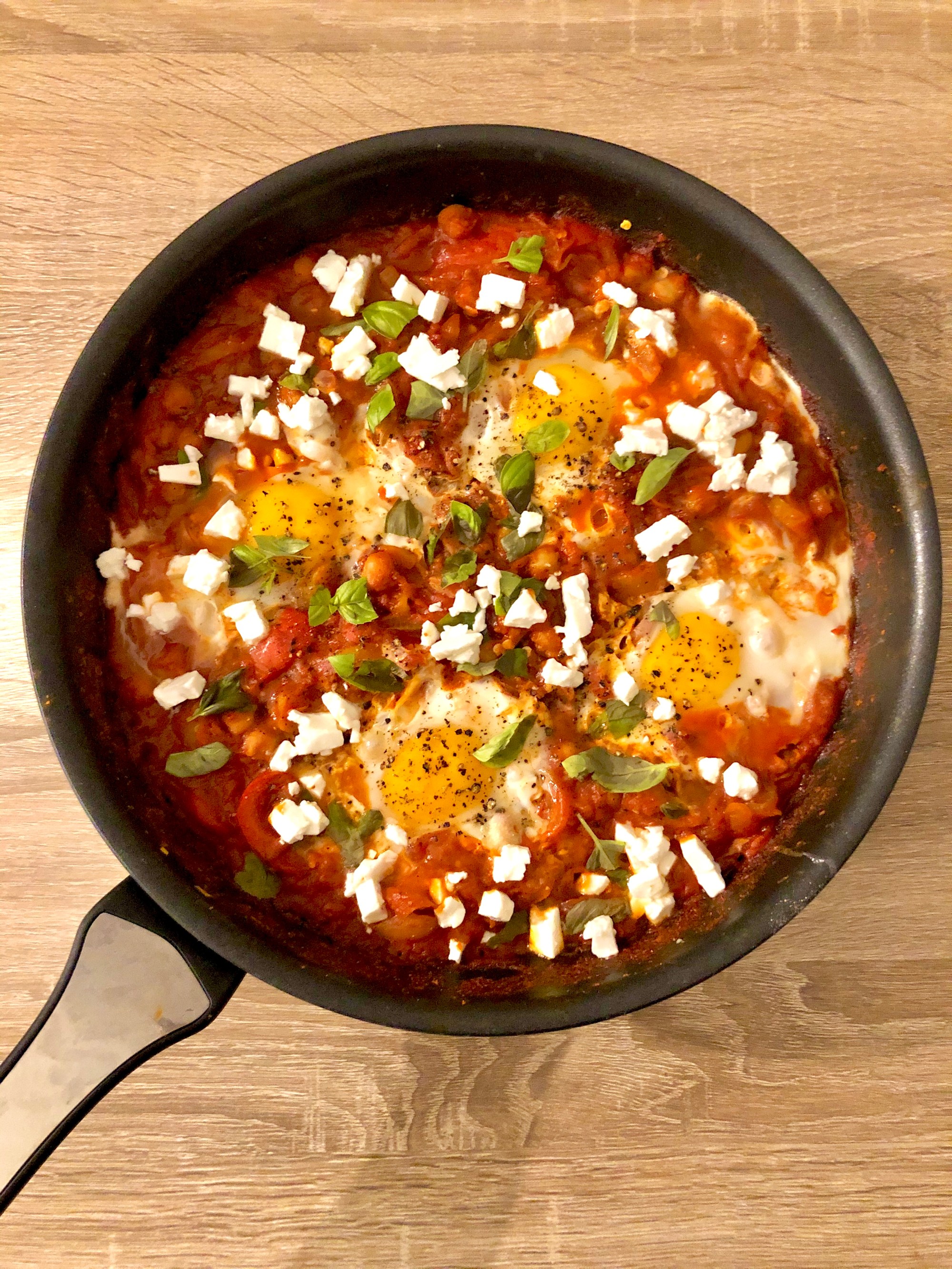 Pour cette recette que j’avais anticipé j’ai intégré des ingrédients frais pour que le plat soit bien gouteux. De plus, c’est une version végétarienne et il y a suffisamment de protéines avec les œufs, la feta et les pois chiche.