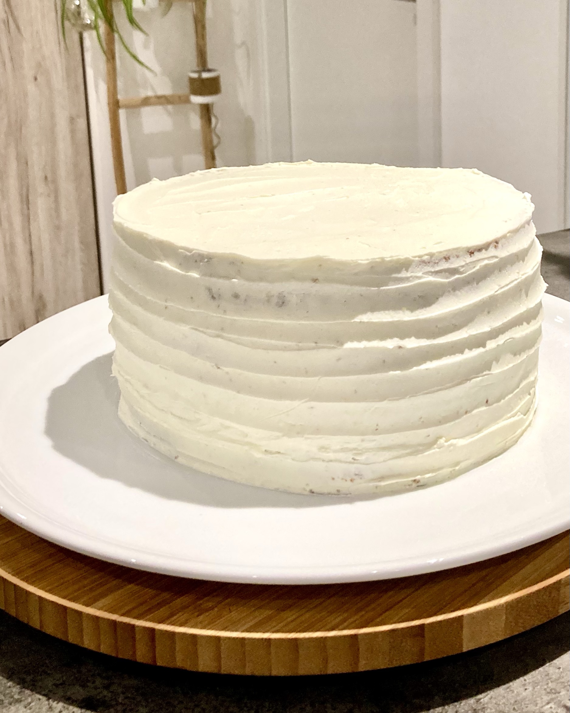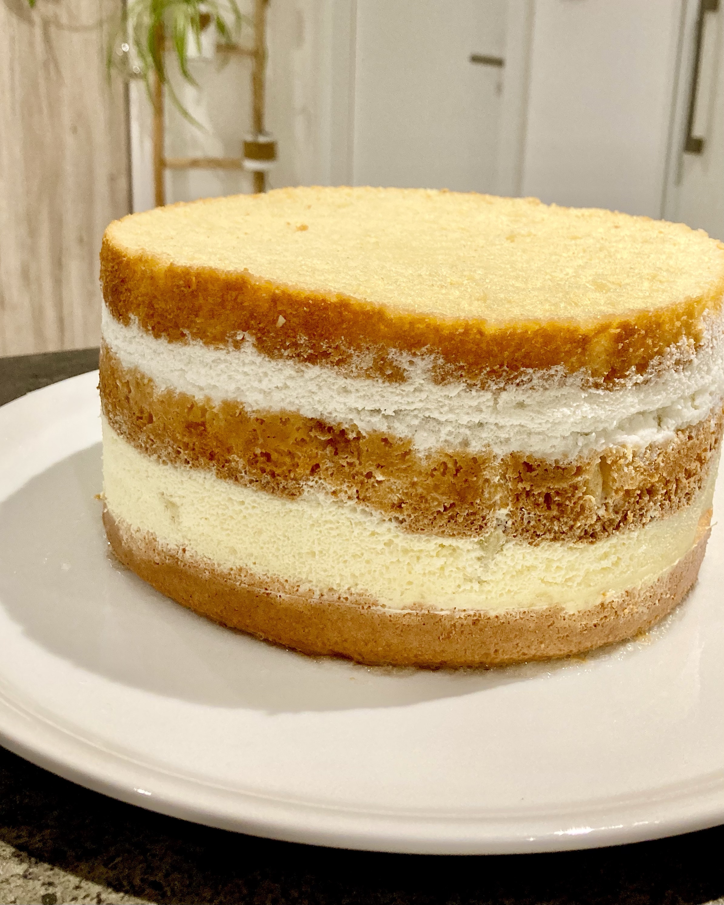 Découper en 3 disques égaux d’environ 2cm grâce à un long couteau et un plateau tournant idéalement, en enlevant la bosse du dessus pour avoir une surface droite