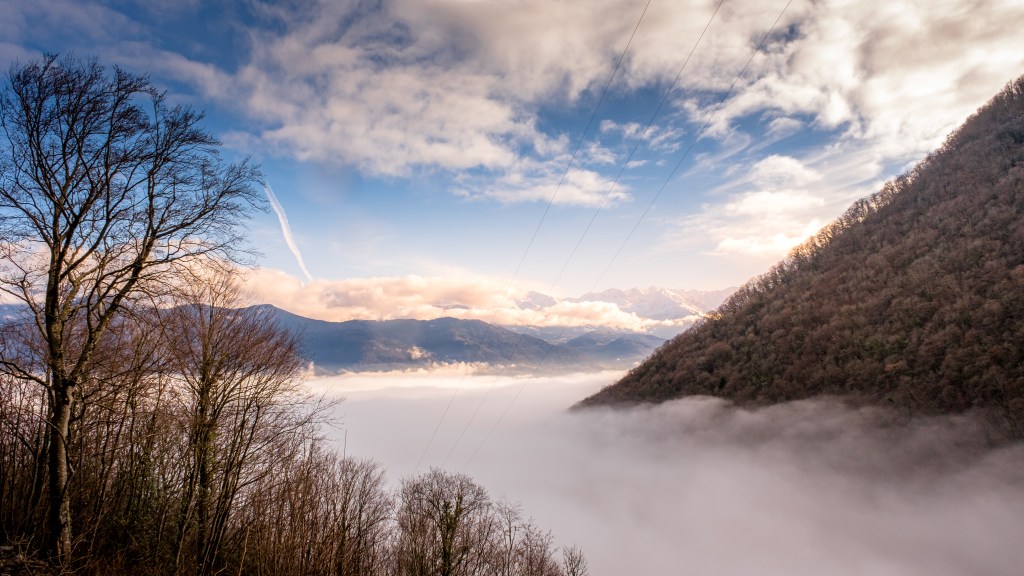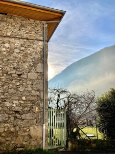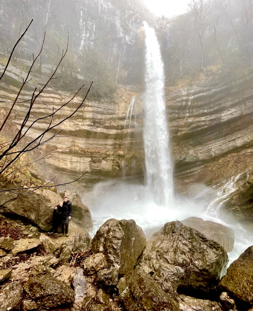 Nous devions ensuite passer derrière le rideau d’eau de cette cascade et là, surprise, la montagne de Belledonne pointait le bout de son nez, au-dessus d’une mer de nuages … Quel plaisir, quelle satisfaction. Revoir la montagne pour la première fois lors d’un nouveau séjour est toujours si impressionnant pour moi.