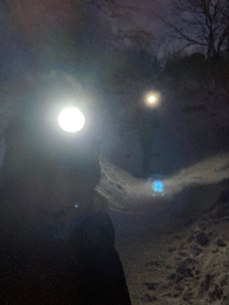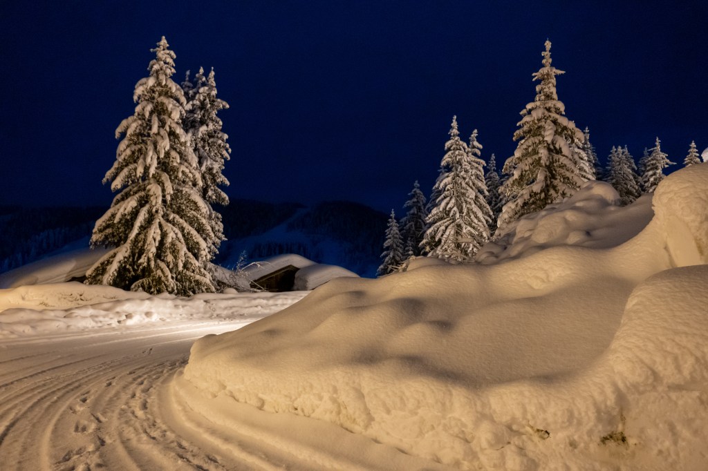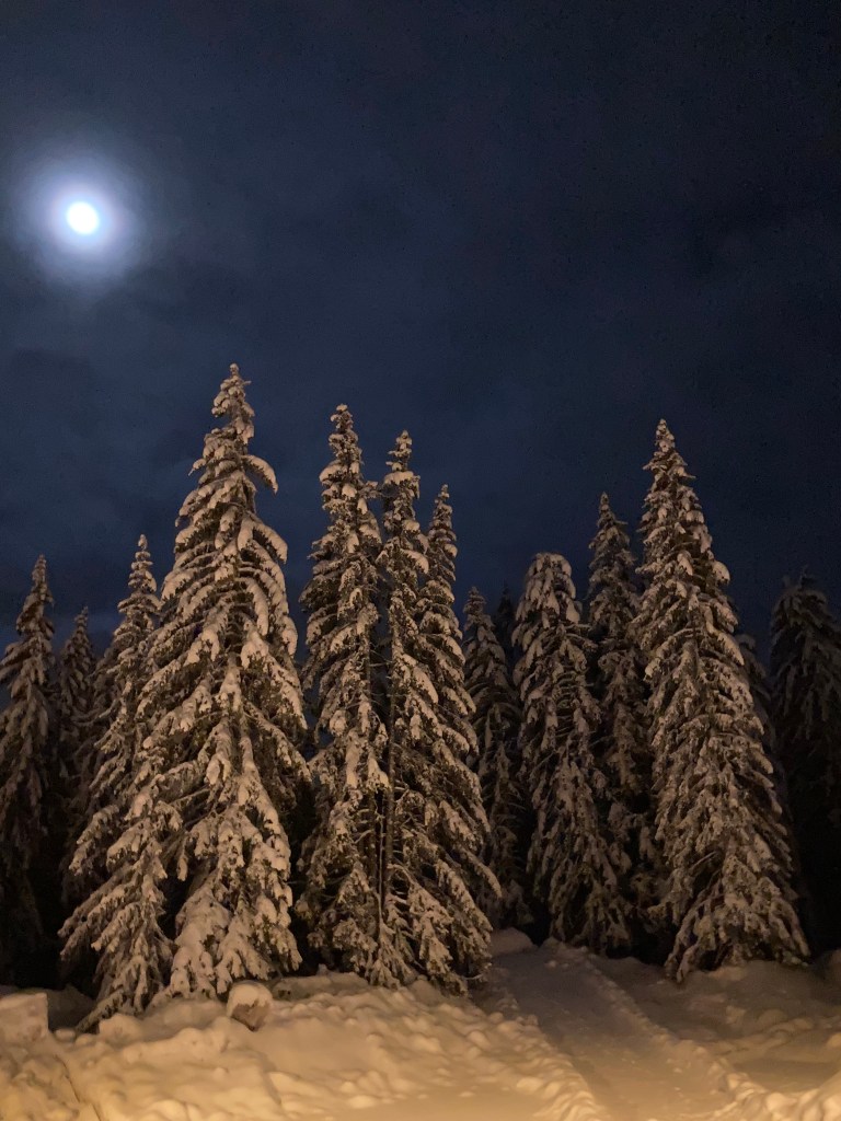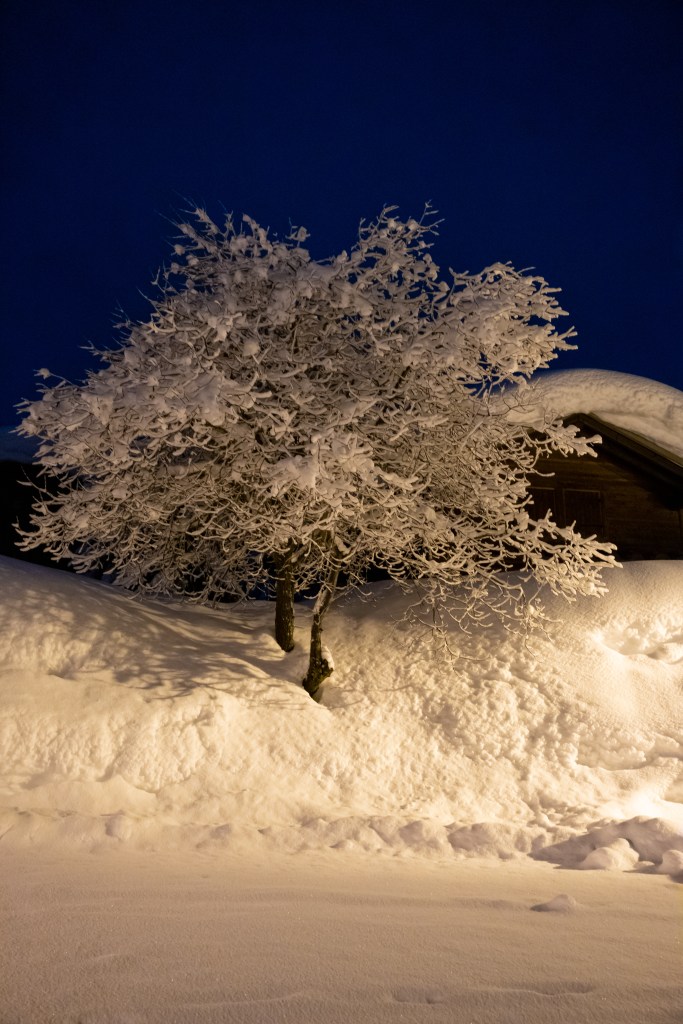 Durant la nuit, je me suis réveillée et j’ai regardé par la fenêtre: les sapins enneigés étaient éclairés par la lune… Quel beau spectacle. J’en ai profité pour prendre quelques photos et nous sommes finalement sortis à 3h30 pour faire une balade nocturne. Tout était recouvert par la neige fraîche qui était tombée la veille, tout était calme, la neige craquait sous nous chaussures, nous étions seuls, le pied.