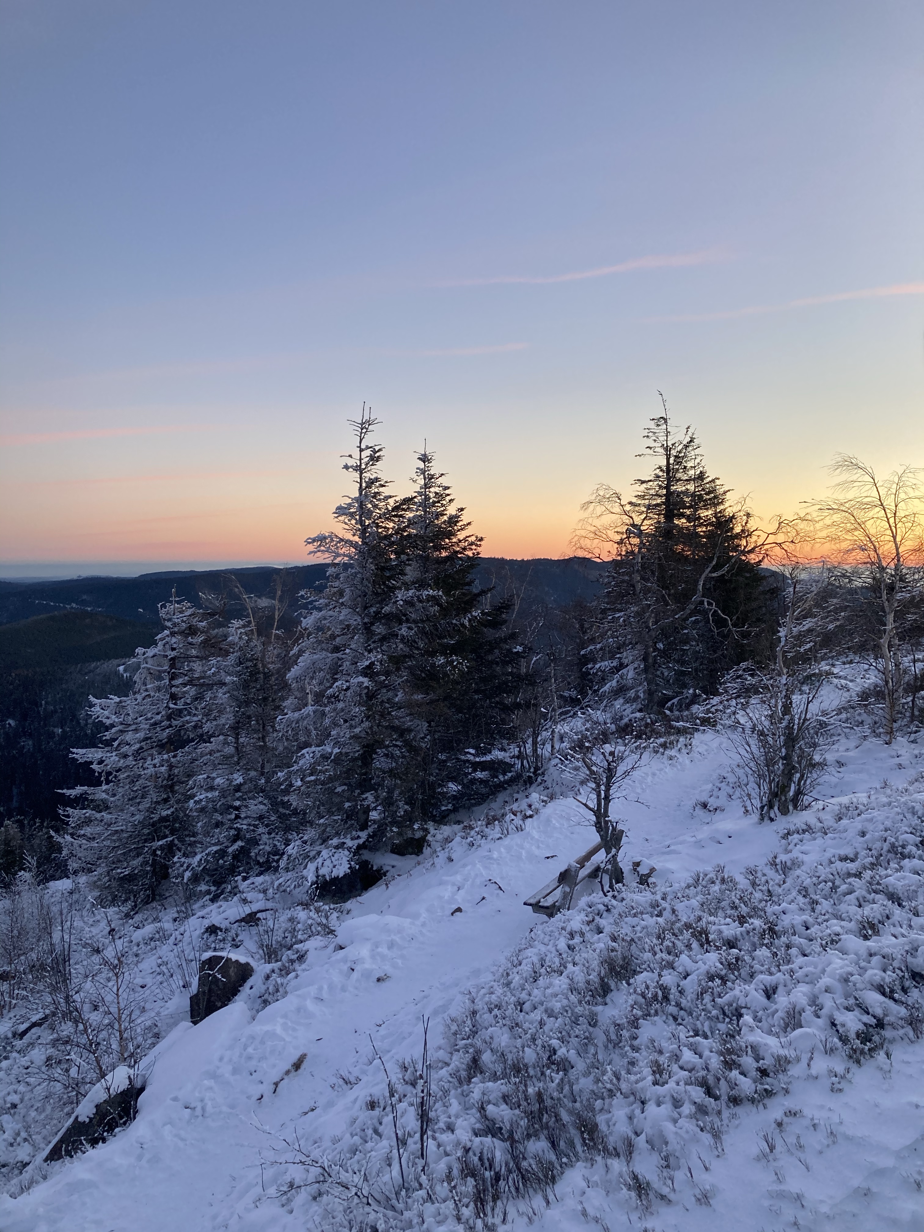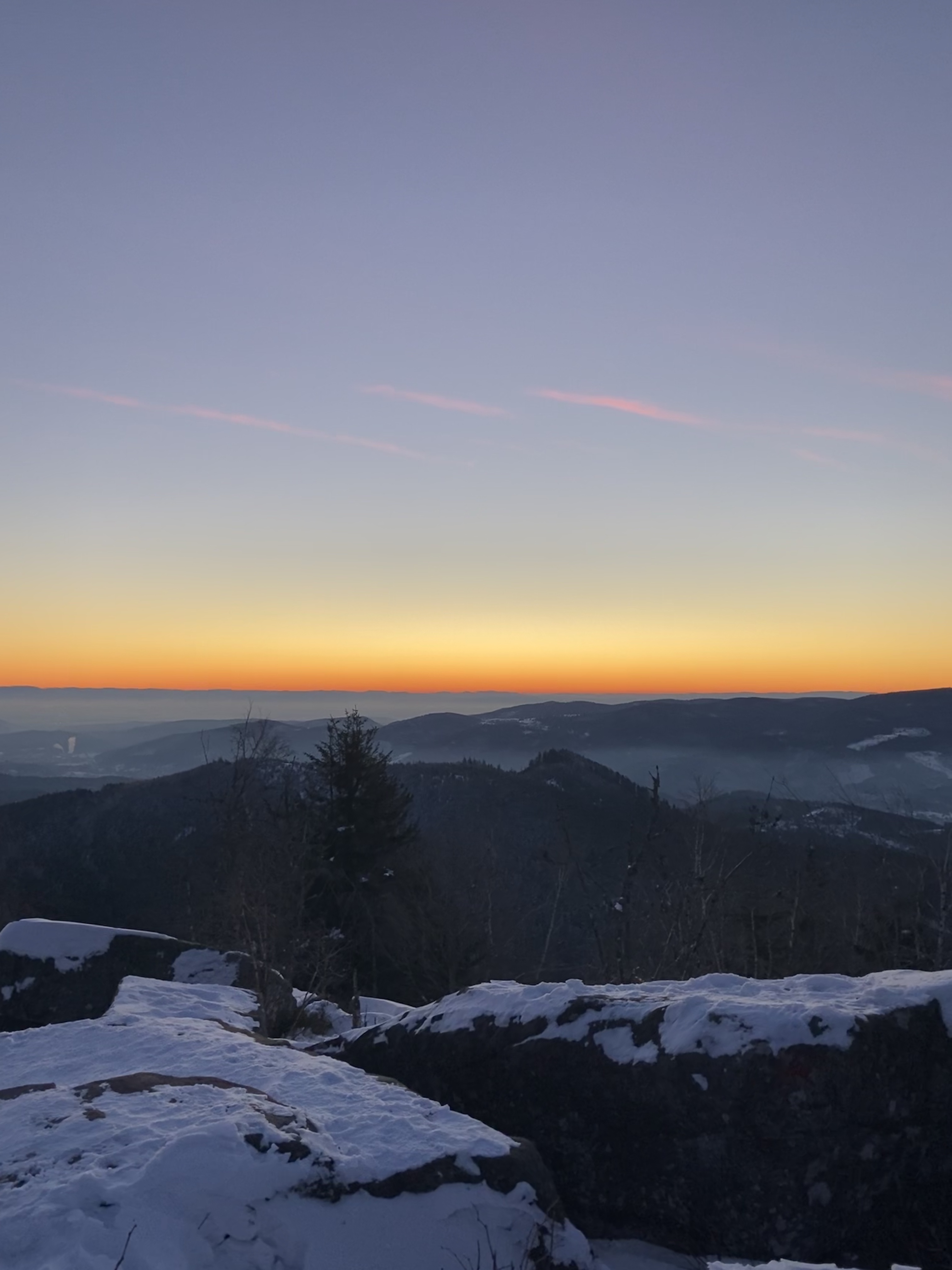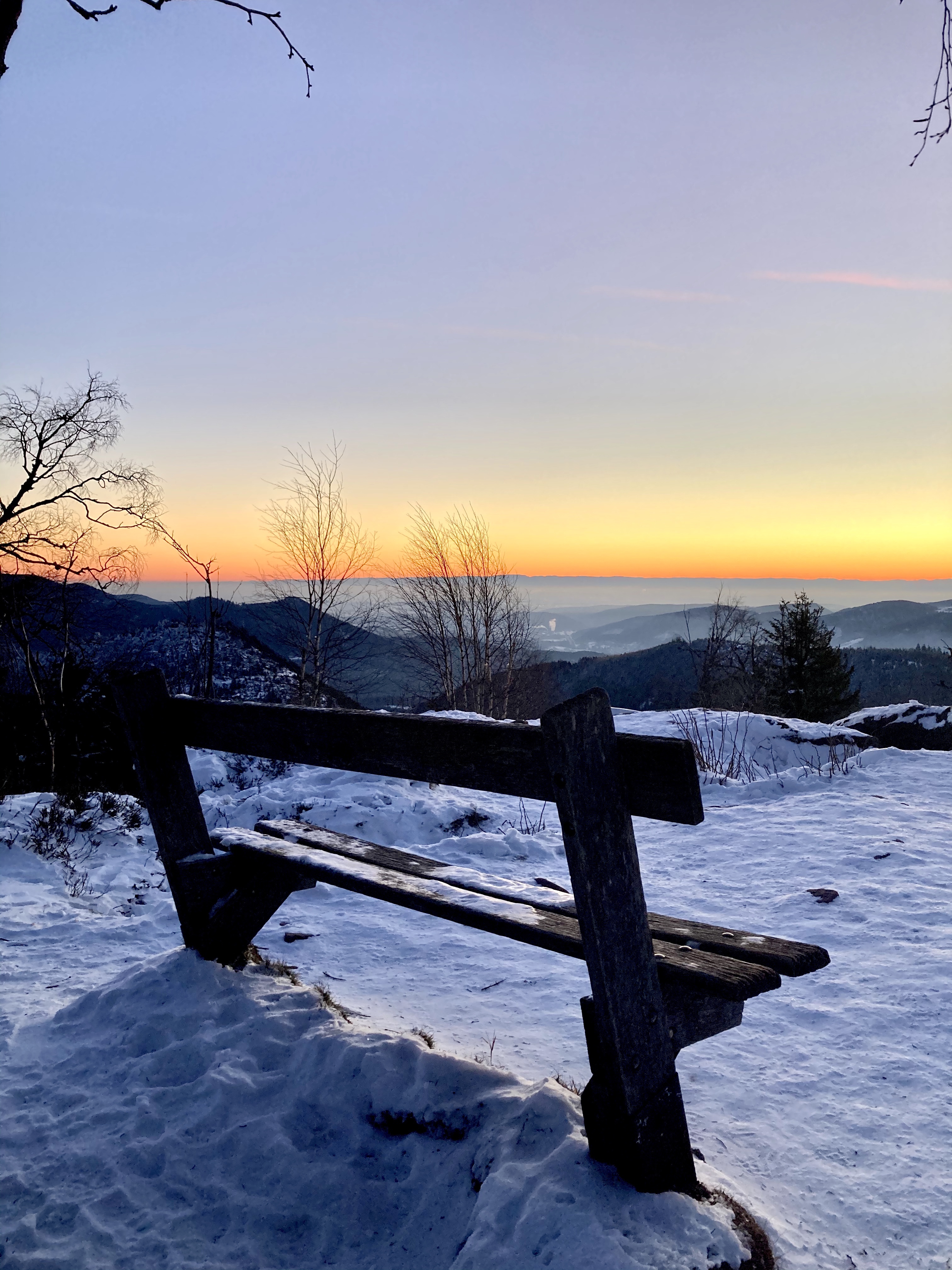 Nous avons repéré plusieurs endroits dans les Vosges mais la plupart sont encore enneigés, la température est encore trop fraîche en altitude et nous n’avons pas acheté de matériel spécial basses températures. (Plus cher et plus volumineux, nous voulions d’abord débuter par faire du bivouac au printemps/été avant de se lancer dans le bivouac plus poussé, à devoir affronter les basses températures)