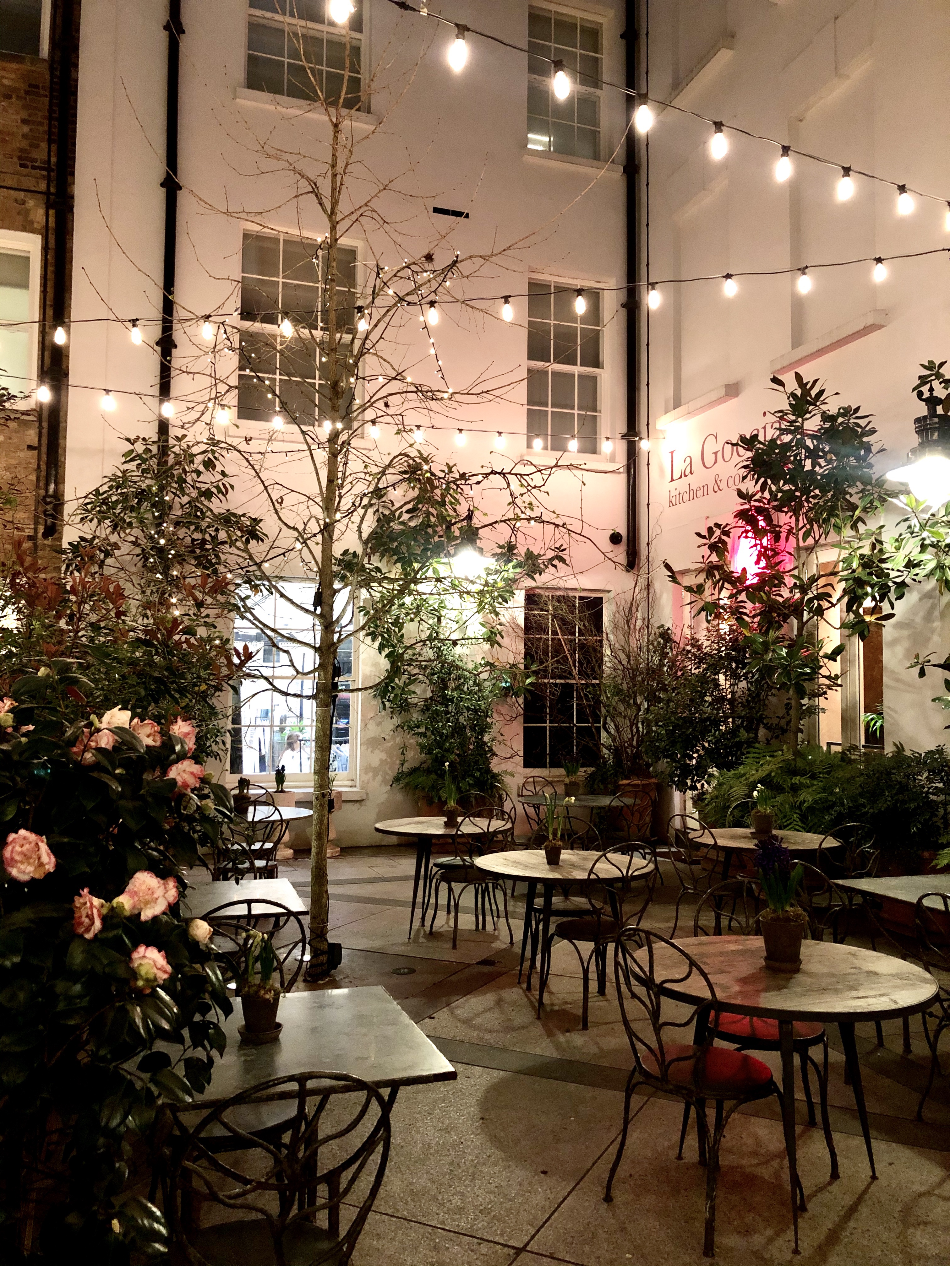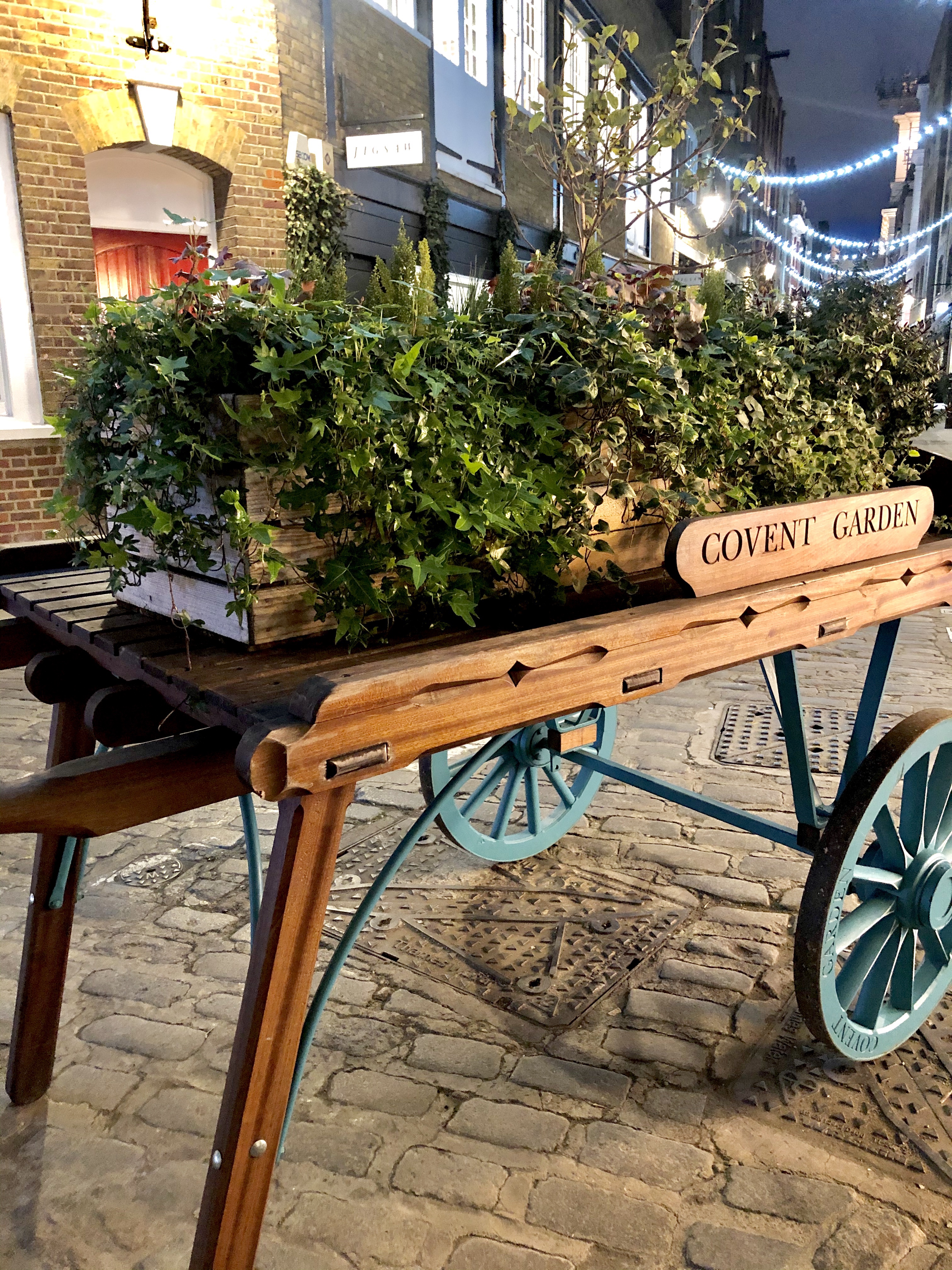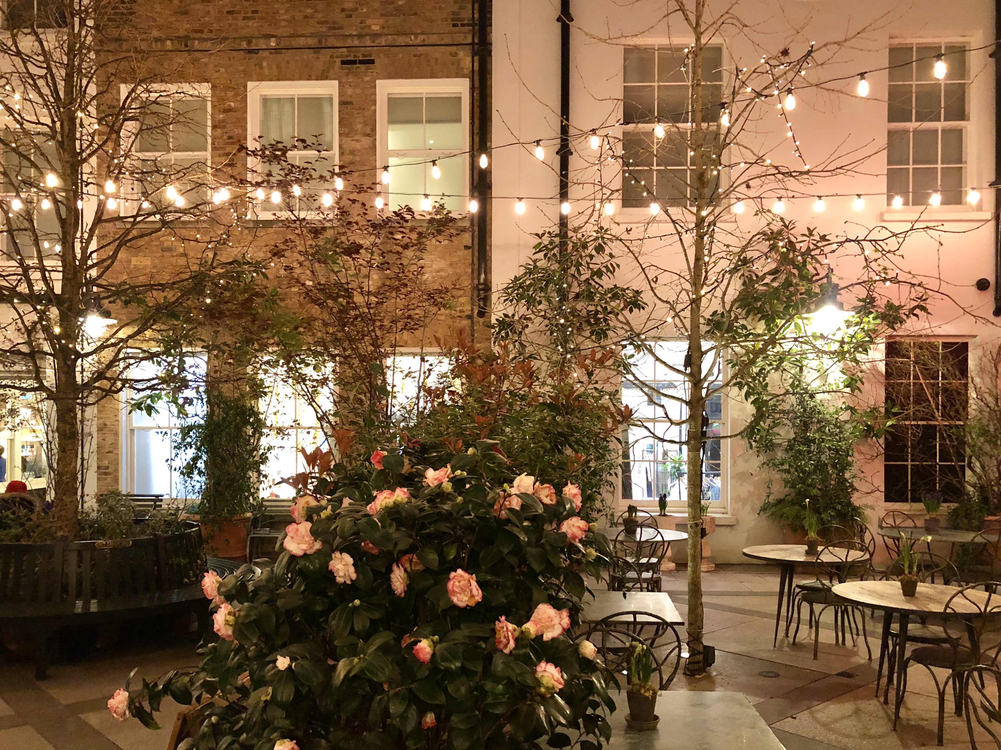 Arrivée à Covent Garden, je retombe sous le charme, il y a à nouveau un chanteur d’opéra et un autre vieil homme qui joue de l’harmonica sur la place à l’avant. Je me rends ensuite dans une ruelle avec des guirlandes lumineuses et j’arrive devant une cours qui attire mon attention… j’arrive dans le lieu le plus magnifique de ce quartier. Coup de cœur. Une petite place avec un banc, des arbustes, des fleurs, des petites tables, des guirlandes lumineuses, des lanternes avec des bougies. L’ambiance est paisible, zen, romantique, tamisée. J’adore. Je m’assieds sur le banc et j’admire.