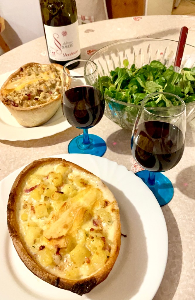 Au menu pour ces trois soirs à la montagne: galette bretonne, raclette, croziflette et tartiflette de Mamie Tartiff’ dans une croute de pain.. Délicieux !!
