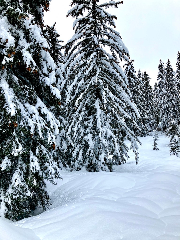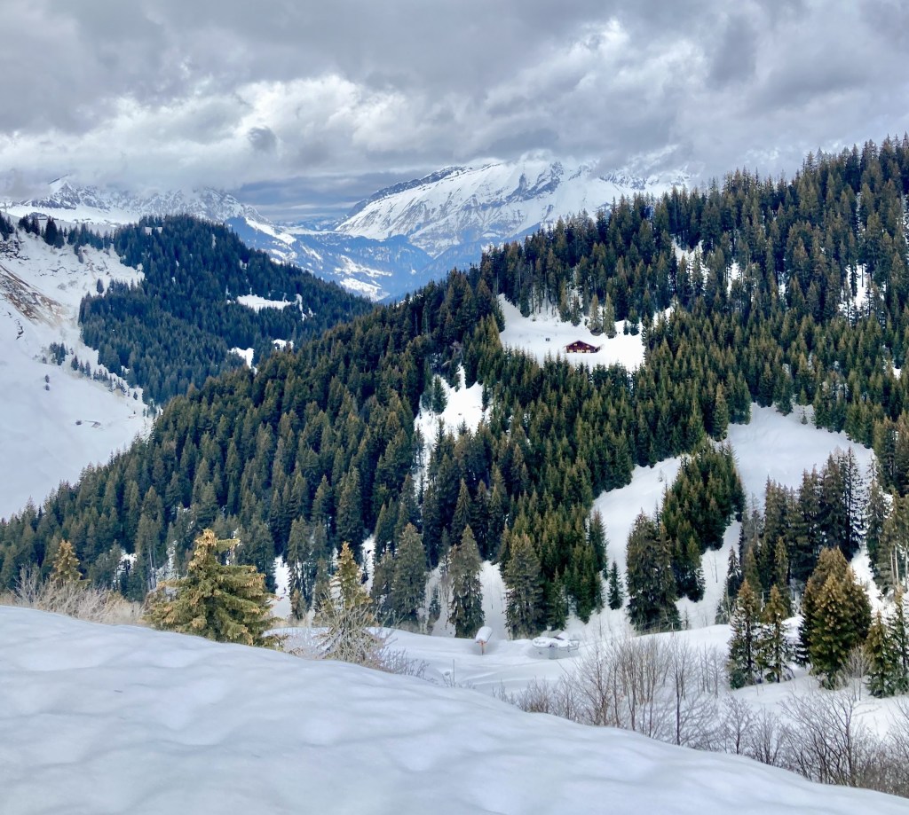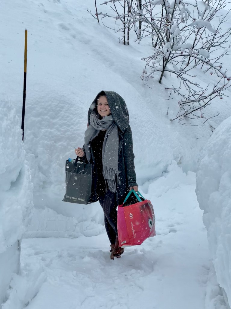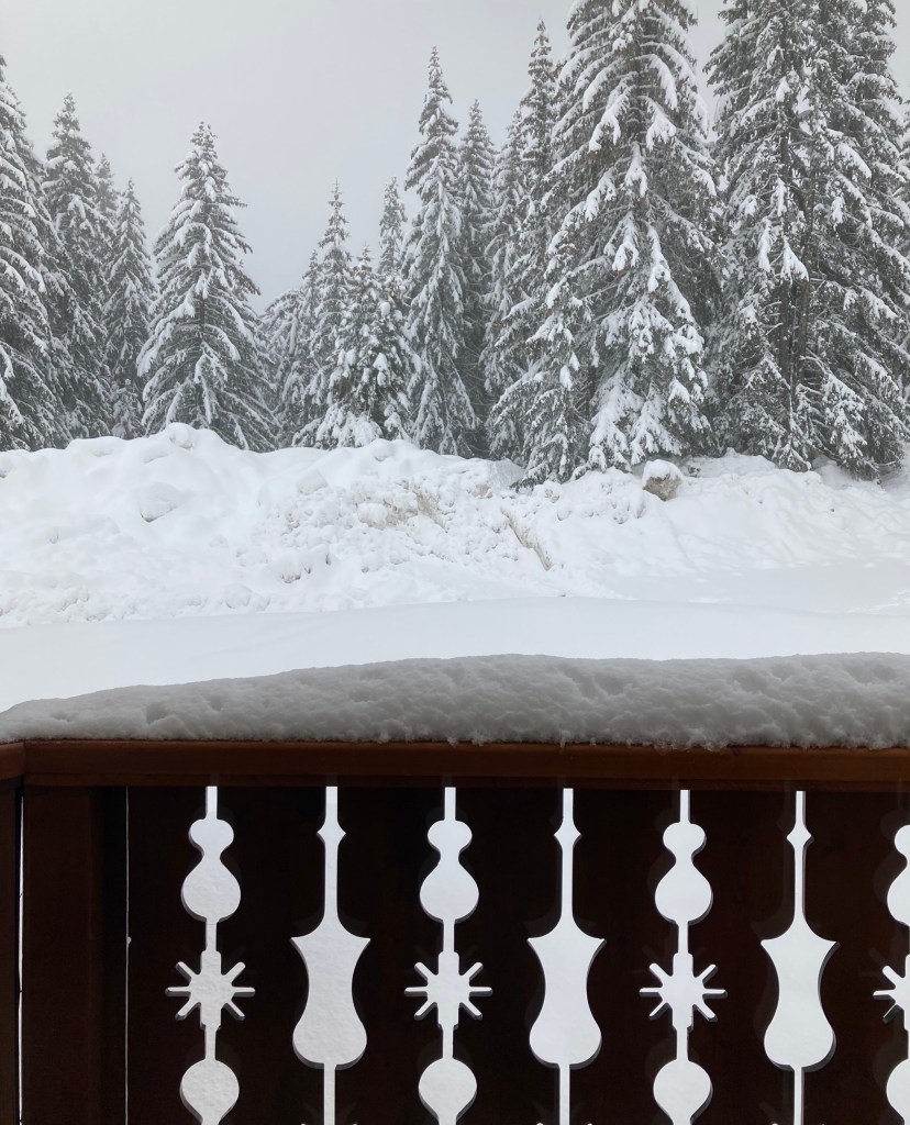 J’étais au départ assez déçue par la météo, je m’imaginais de belles randos avec un paysage blanc, un ciel bleu, avec les montagnes en arrière-plan. Et à la place, c’était couvert, gris, pluvieux… Que faire quand la météo n’est pas de la partie, à part accepter et faire avec ? Je suis normalement adepte de voir le bon côté des choses, mais j’avoue que cette fois j’avais du mal.