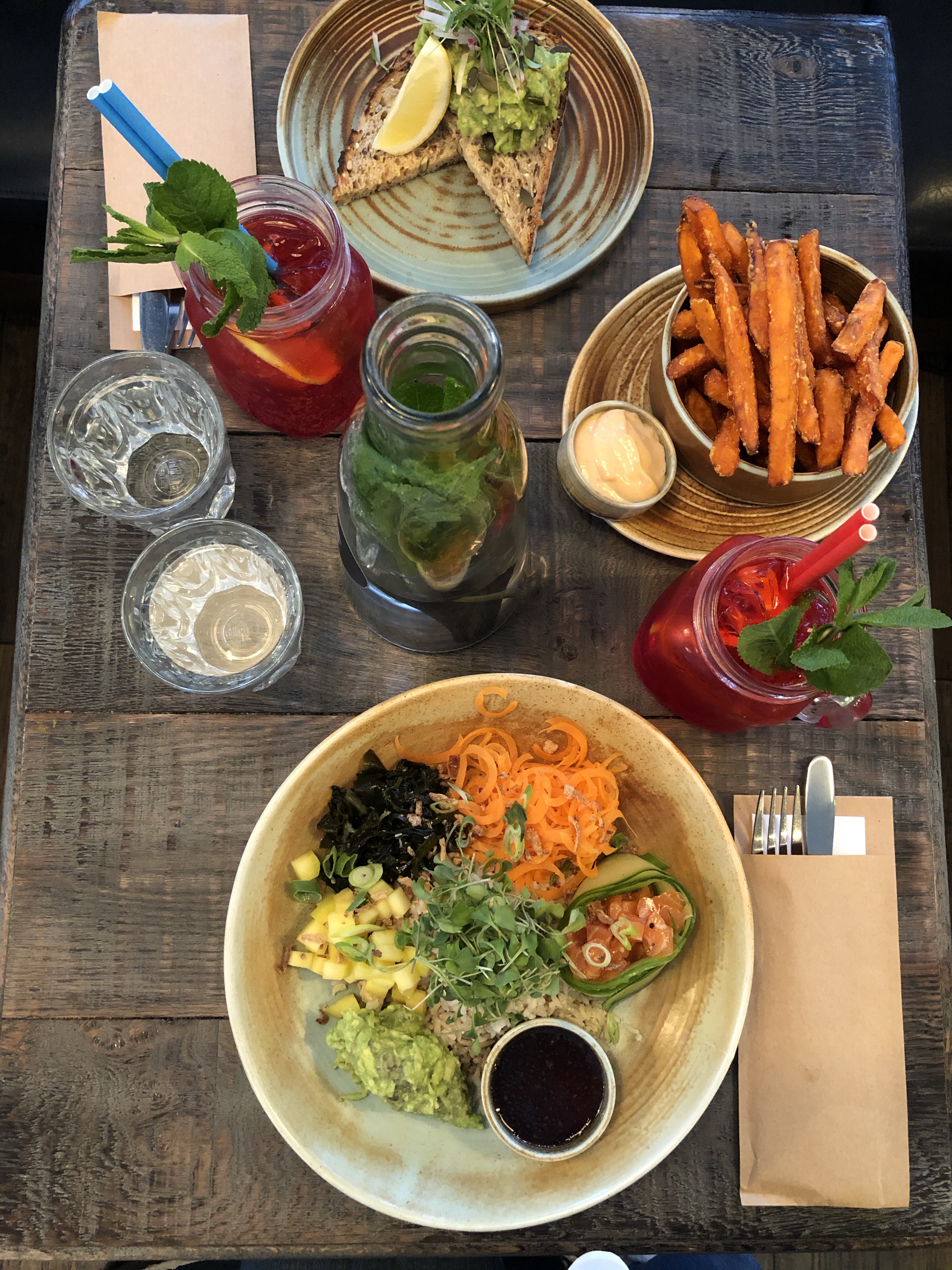 Nous avons ensuite pris le bus pour aller manger au Local Café, une des adresses que j’avais repérée en amont parce que j’avais sélectionné plusieurs cafés healthy avec des plantes vertes, au cas où nous n’en trouvions pas sur notre chemin, et c’était super chouette. J’ai adoré mon assiette (riz complet, mangue, guacamole, saumon, algues, jeunes pousses, spirales de carottes) j’étais par contre un peu déçue de leur limonade dite homemade à la myrtille et au citron (qui vend du rêve comme ça mais qui en fait correspondait à du sirop industriel, deux tranches de citron et des feuilles de menthe avec de l’eau pétillante).