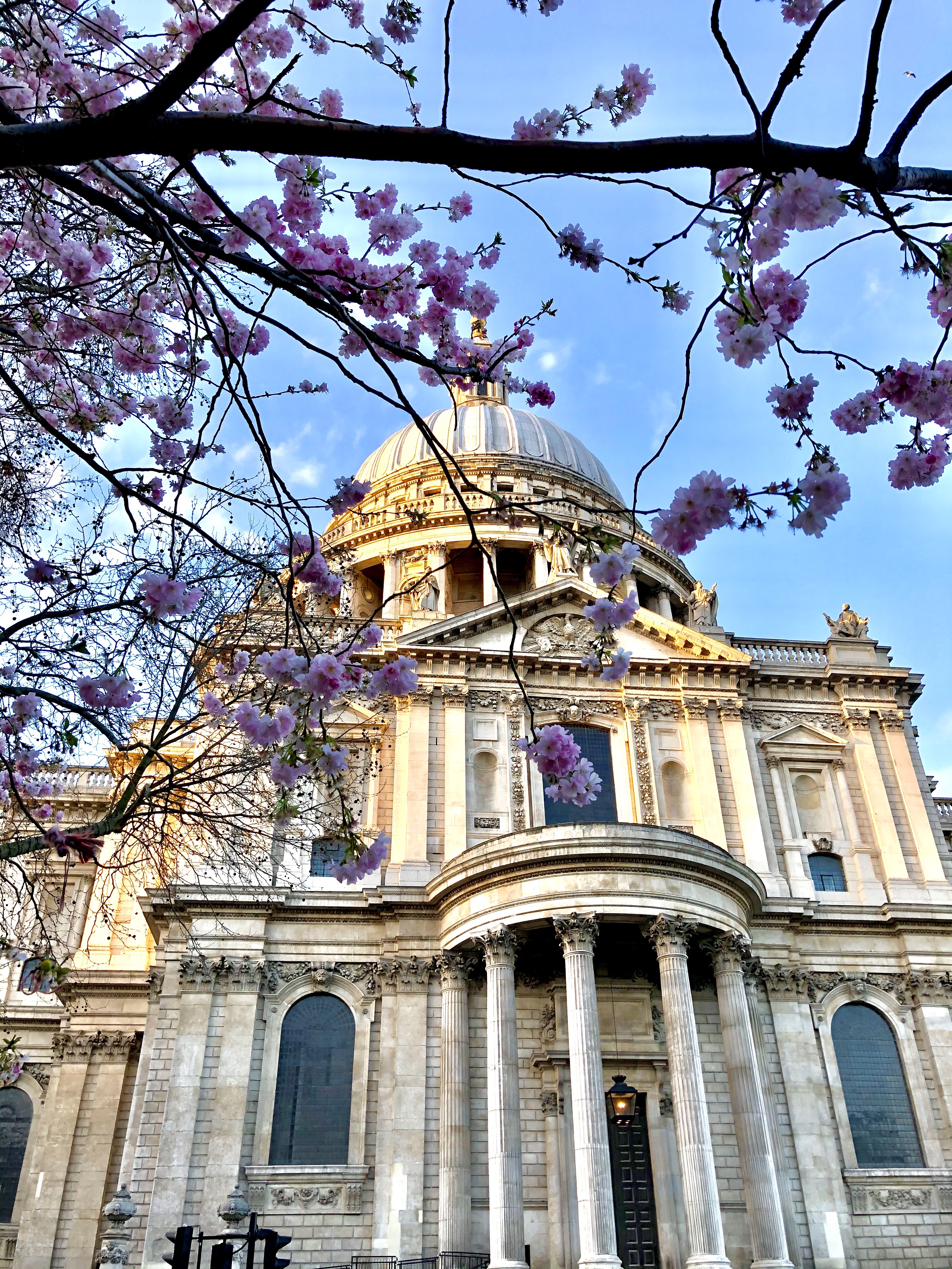 Je prends ensuite la direction de Covent Garden parce que j’ai beaucoup trop aimé et je veux voir l’ambiance du soir. Je traverse le pont en face du Musée pour me rendre de l’autre côté de la Tamise et je passe devant la cathédrale Saint Paul. Il y a un bel arbre en fleur devant, ça fait une belle photo.Je l’aurai au moins vue de près de l’extérieur.