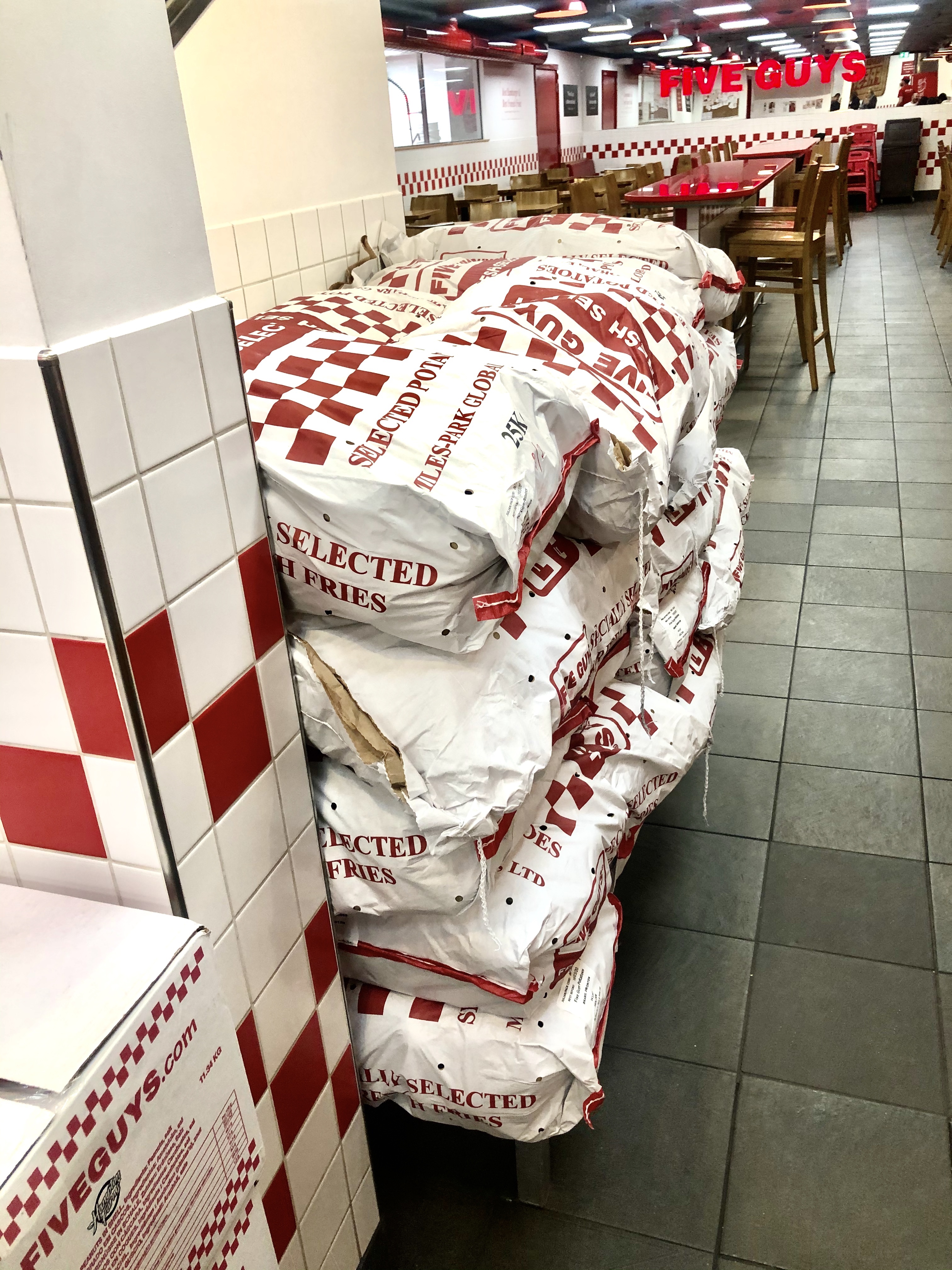 On se raffraichit un peu et on sort boire une bière au pub en face, on se promène ensuite jusqu’à Piccadilly Circus et enfin, on arrive devant un Five Guys. Une tuerie ce burger. On sent que la viande et les frites sont fraîches. On voit même les gros sacs de pommes de terres qui sont entreposés.