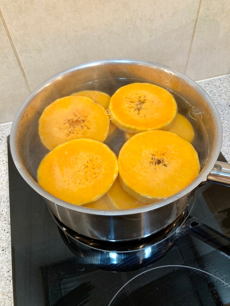 (J’ai pelé et coupé le reste de la courge pour mettre des morceaux prêts à l’emploi dans le congélateur pour une future soupe de légumes)