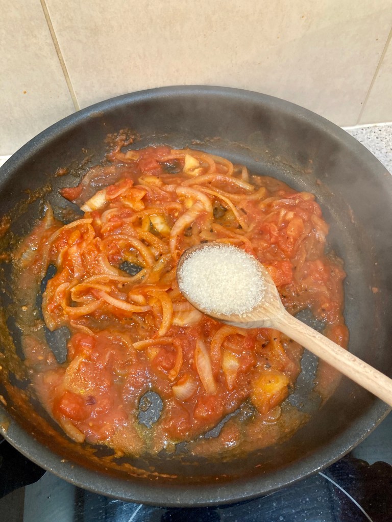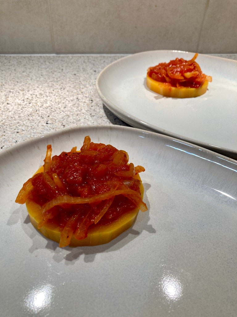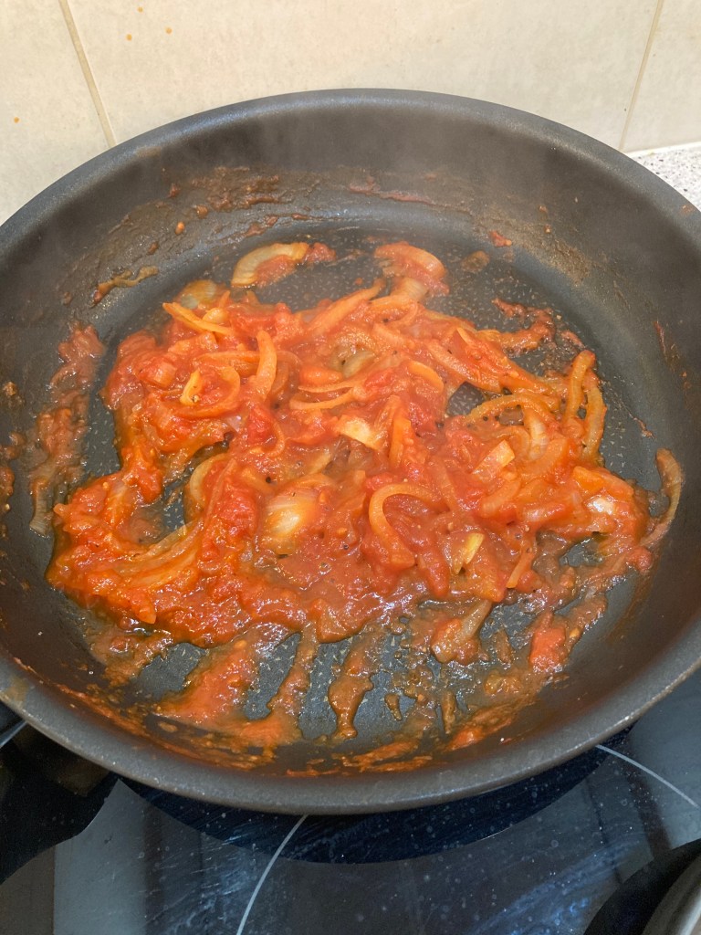En l’absence de Ketchup dans le frigo, j’ai improvisé une petite compotée à la pulpe de tomate/oignon: