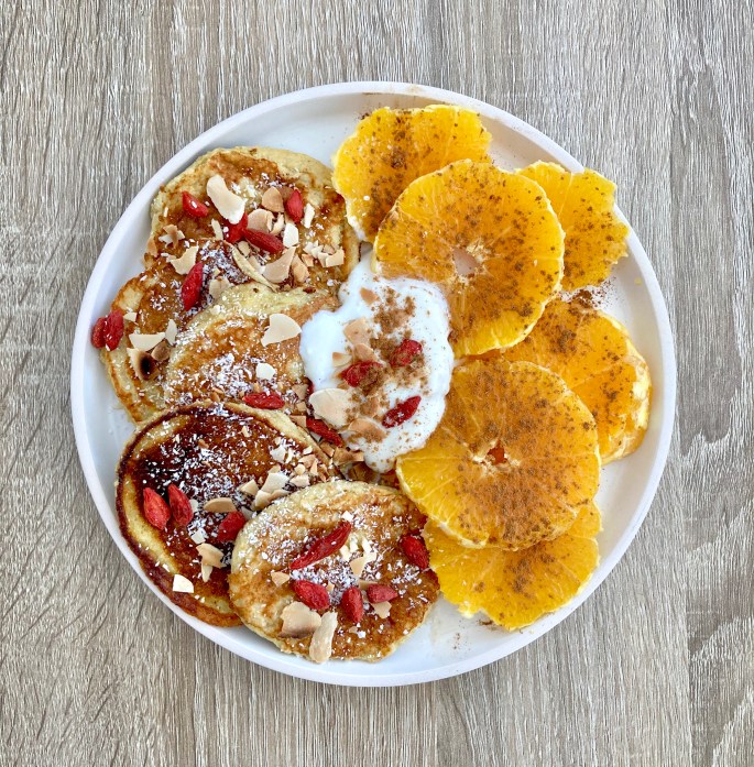 Contrairement aux pancakes traditionnels américains composés de farine blanche et de beurre fondu, ceux-là sont beaucoup plus sains et peuvent être consommés sans culpabilité: indice glycémique bas, sans sucre raffiné ni graisses saturées, protéinés grâce à l’œuf, le fromage blanc et le son d’avoine, ils sont parfaits pour un petit déjeuner qui tiendra dans l’estomac toute la matinée.