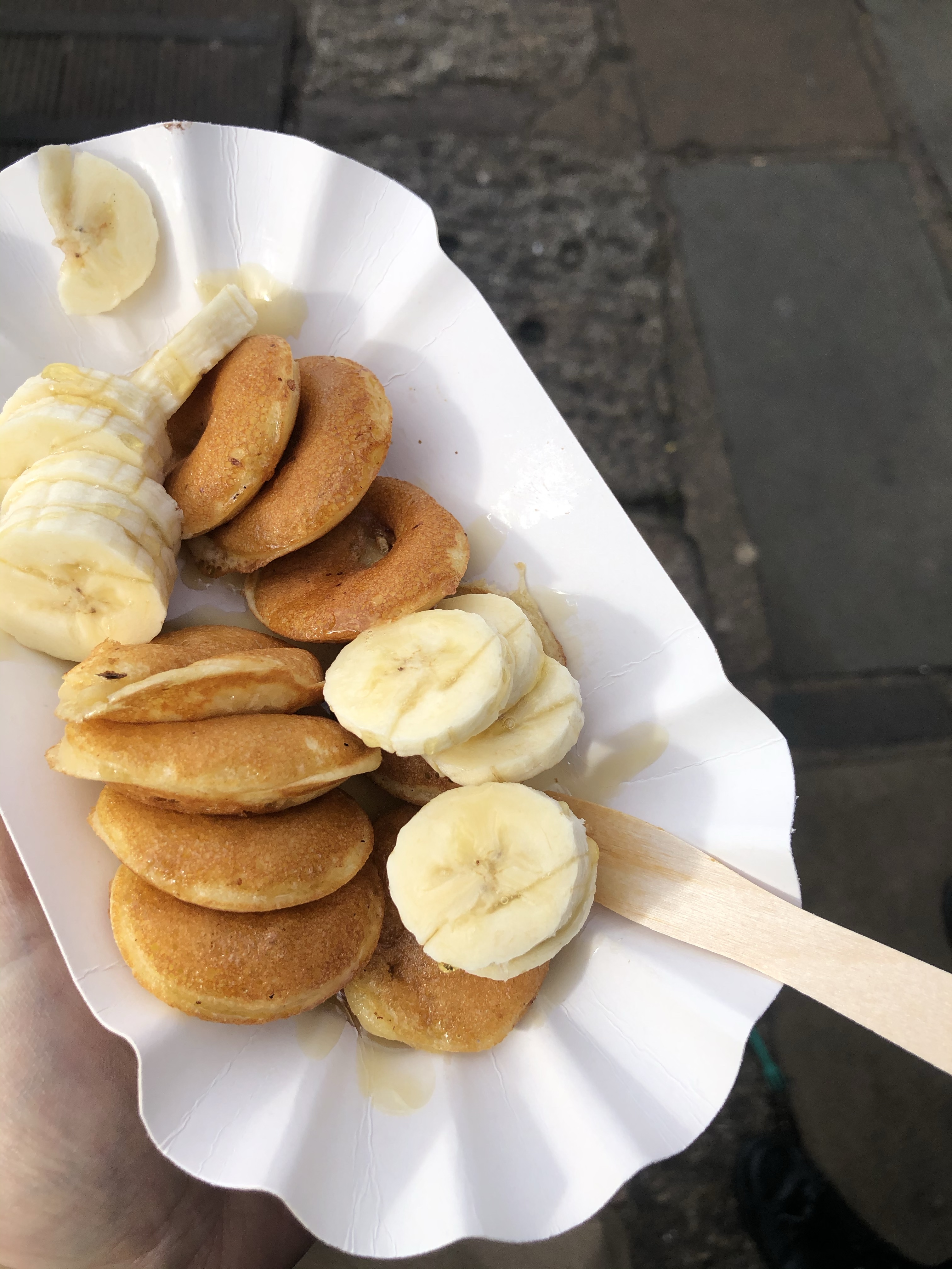 En dessert des petits pancakes. Sur le stand il est écrit « dutch Pancakes – poffertjes » étant allée en Hollande l’année dernière et ayant adoré les poffertjes je me suis réjouie d’en manger à nouveau et en demande … J’opte pour banane + sirop d’érable.