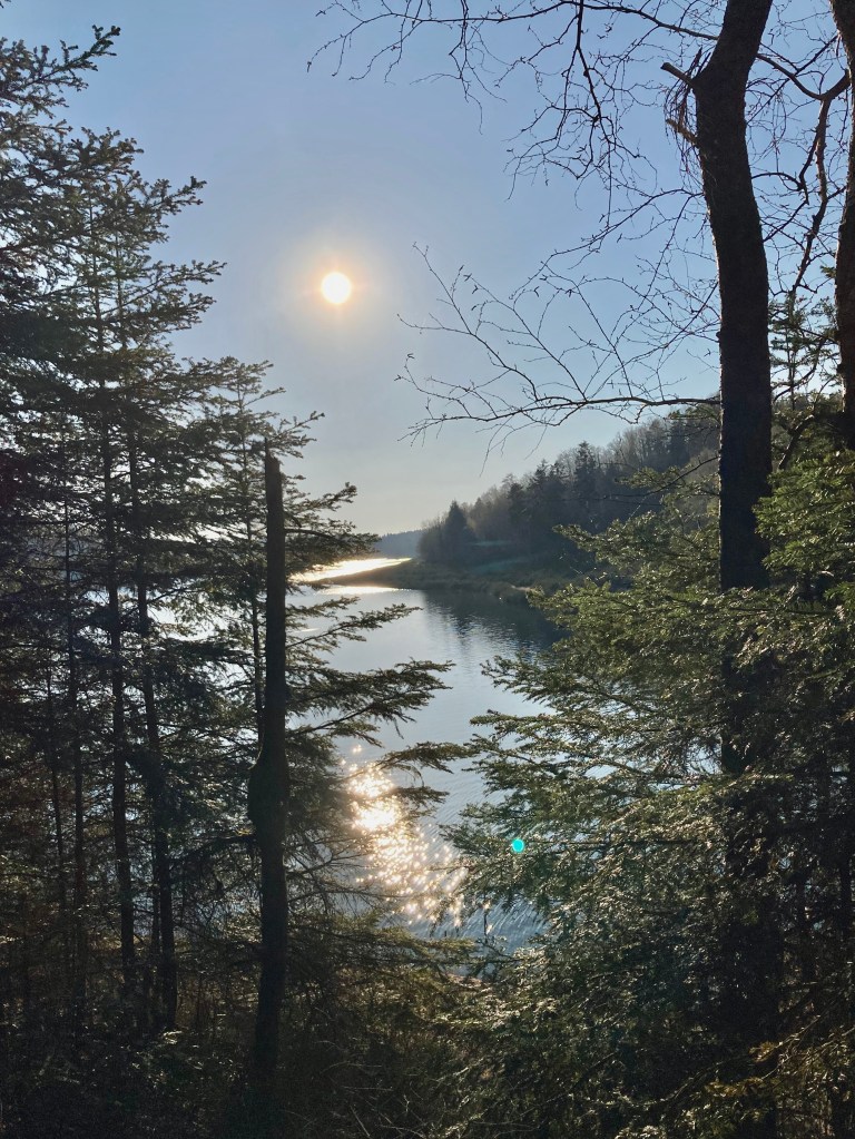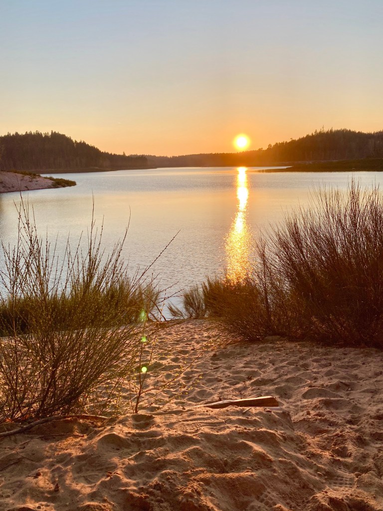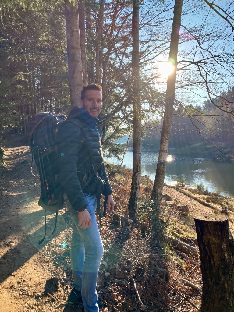 Le soleil se couchant à l’ouest, nous voulons nous placer à l’est pour profiter d’un beau coucher de soleil. Alors une fois garés sur un des parkings à l’est du lac, nous marchons dans la forêt avant de trouver un emplacement qui nous semblait bien, en face du lac et face au coucher du soleil. Etant donné qu’il s’agit de la première fois, ça nous va bien de ne pas faire une randonnée avec fort dénivelé de deux heures à porter les sacs à dos avant de trouver l’emplacement.