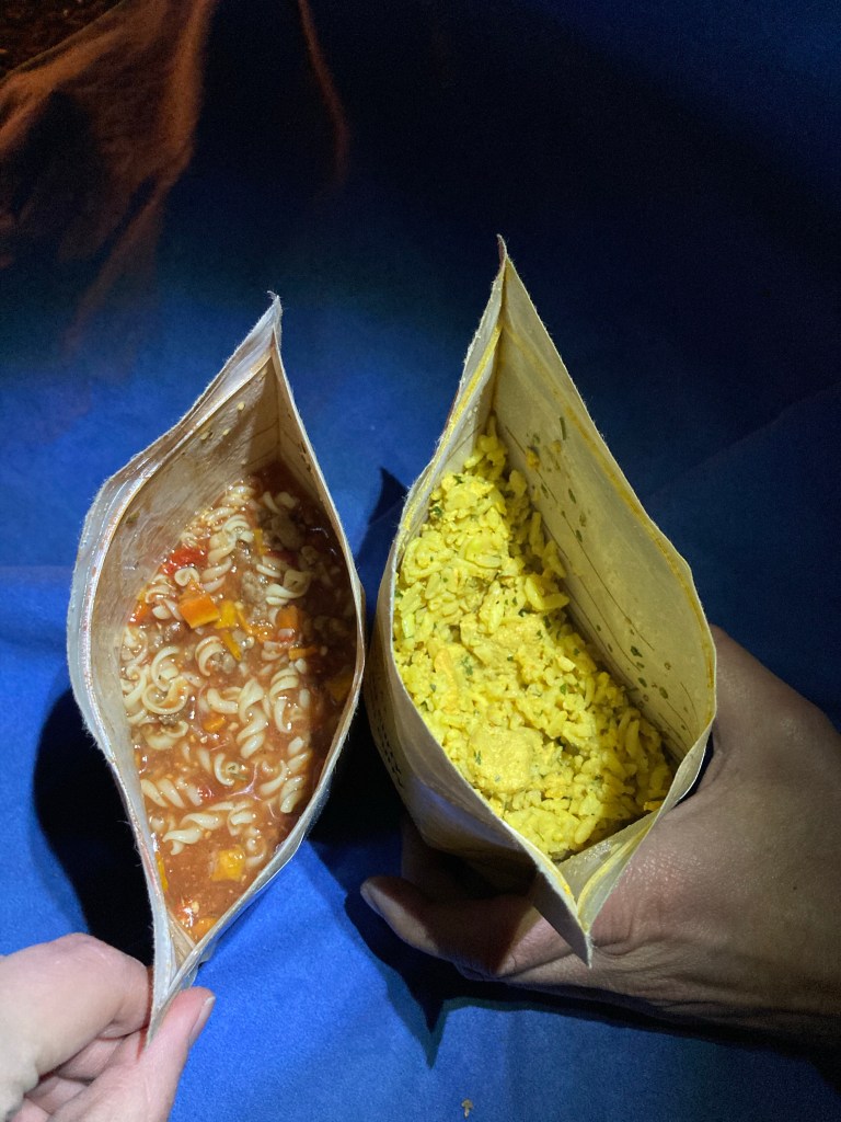 On met en route notre réchaud pour faire chauffer l’eau et réhydrater nos plats. Il suffit d’ouvrir le sachet et verser une certaine quantité d’eau chaude, refermer le sachet et laisser reposer pendant environ 10min. Un peu septique au départ parce que nous sommes adeptes de l’alimentation fraîche en général, c’est une agréable surprise!