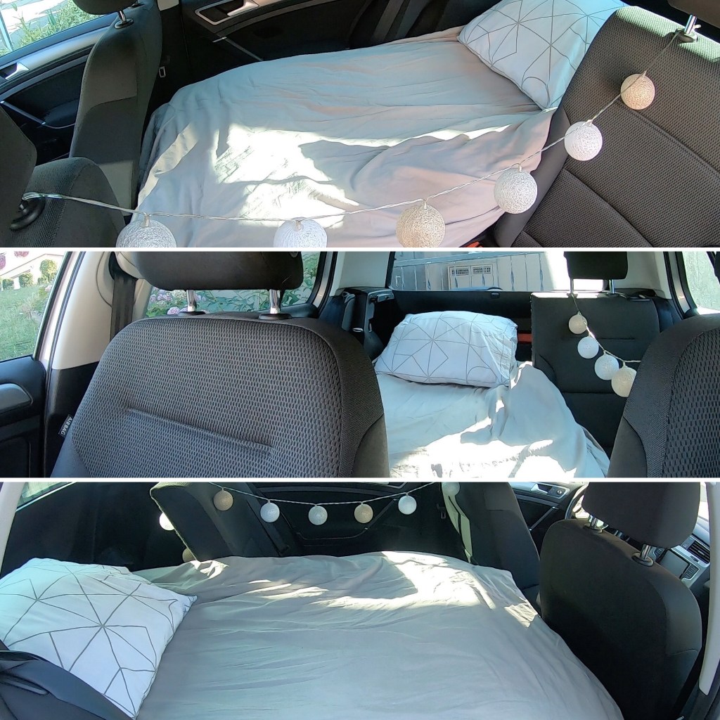 Les sièges arrières se plient de sorte à faire un lit, il y aussi possibilité de dormir dans la tente de toit.